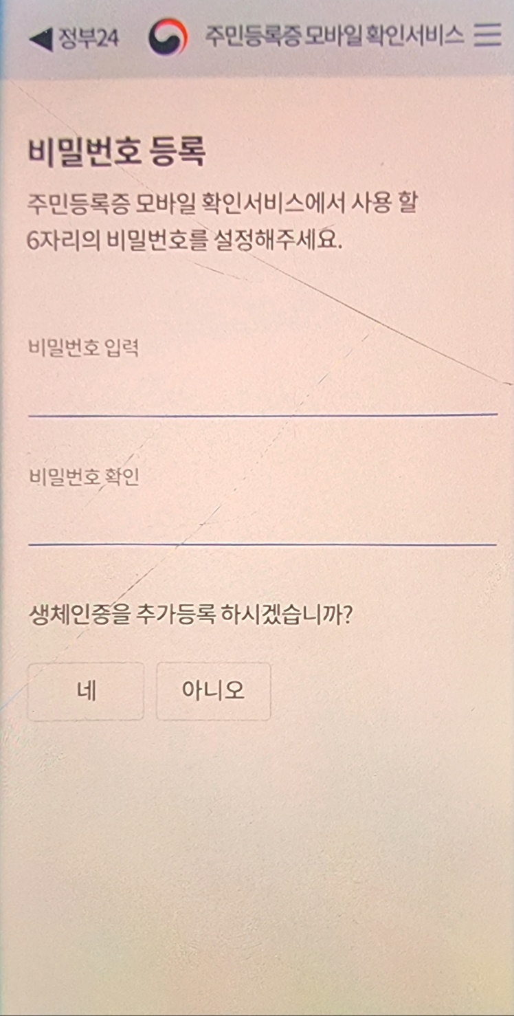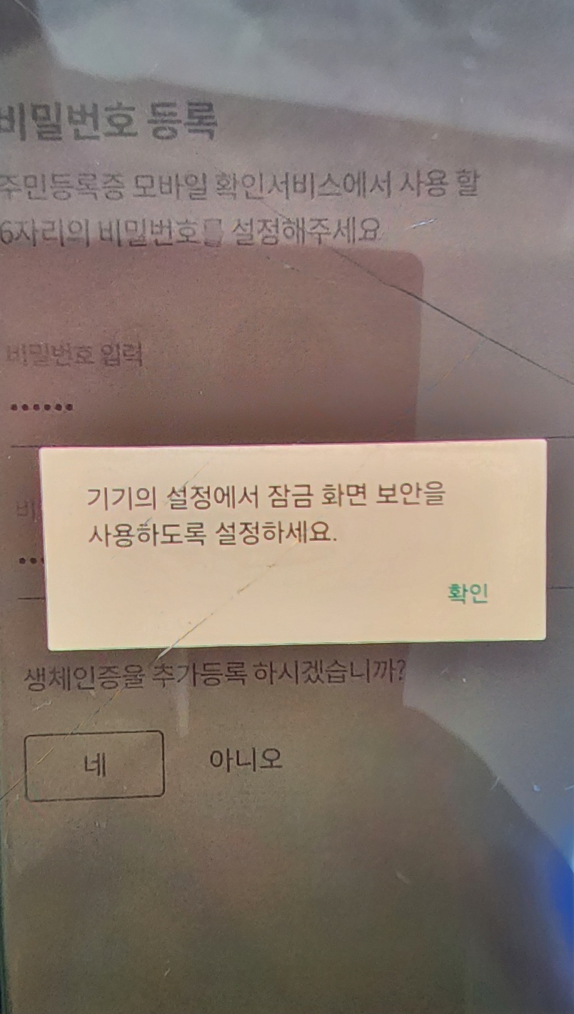 생체인증(지문)을 원하시면 '예' 버튼을 누르시면 자동으로 내 휴대폰 설정으로 들어가는데 처음부터 다시 해야한다는 점은 꼭 유념하여 주시기 바랍니다. 저는 신분증이니 괜히 생체등록을 해야 할 것 같아서 하긴 했는데요, 평소 휴대폰 잠금을 안해 놓는 분들은 생체인증(지문) 안하시는 것을 추천드립니다.