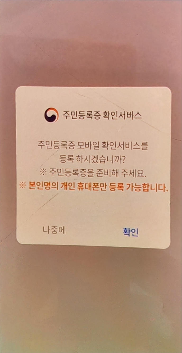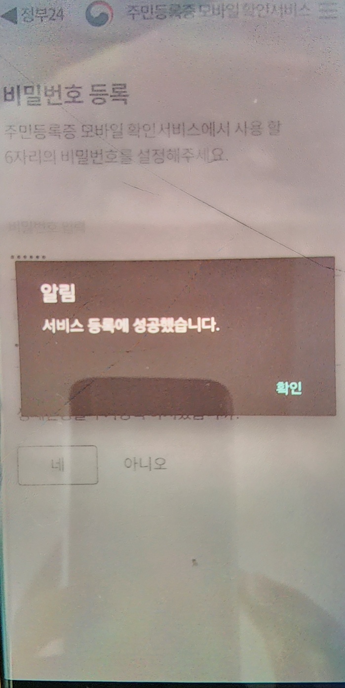 개인정보라 제 모바일 신분증은 못 올렸는데요, 아래처럼 '서비스 등록에 성공했다'라고 팝업이 뜨고 '확인'버튼을 누르면 모바일 신분증이 바로 뜨게 됩니다.