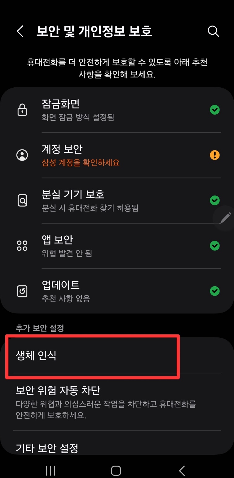 아래는 휴대폰 설정에서 생체인식 지문등록을 하는 방법입니다.
