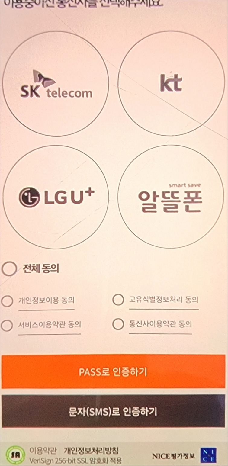 통신사 인증 단계에서 '문자로 인증하기' 버튼이 '전체동의하기' 누르니 갑자기 사라지고 'pass로 인증하기'만 남아 pass로 인증할 수 밖에 없었습니다.
