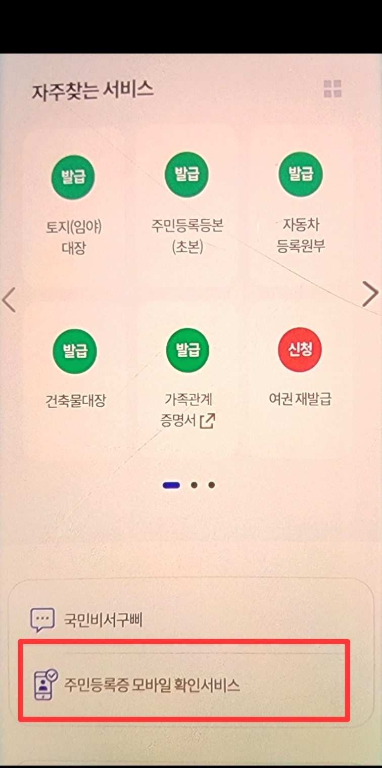 2. 로그인 완료 되었다면 메인 화면에서 글 아래로 천천히 내려보시면 '자주 찾는 서비스'가 보이실텐데 빨간색으로 네모박스 해 놓은 '주민등록증 모바일 확인서비스'가 있는데 그곳을 클릭하세요