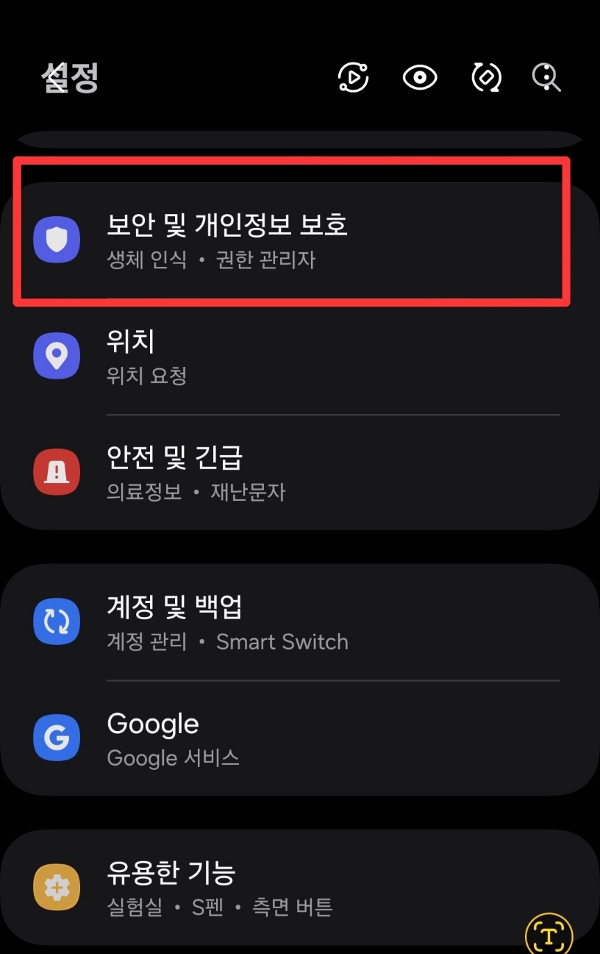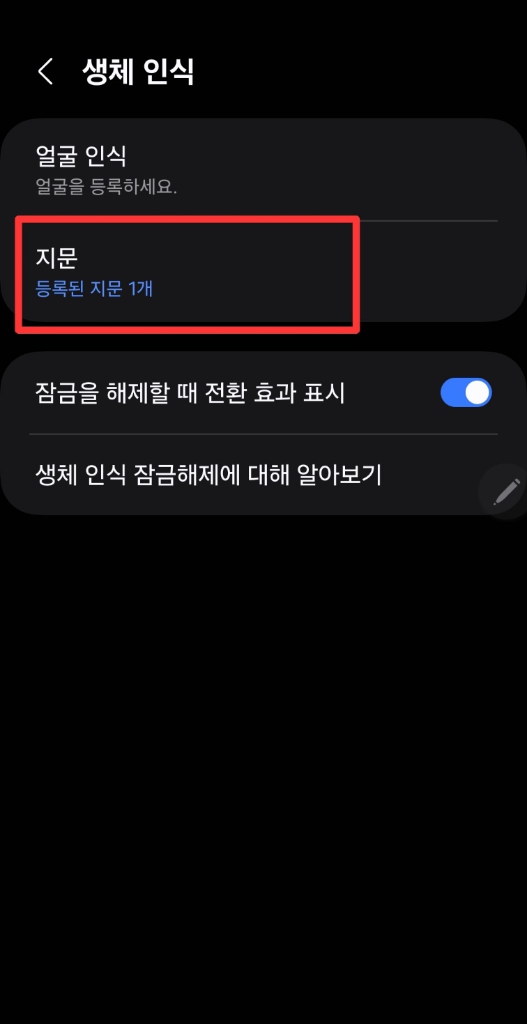 휴대폰 설정 -> 보안 및 개인정보 보호 -> 생체인식 -> 지문